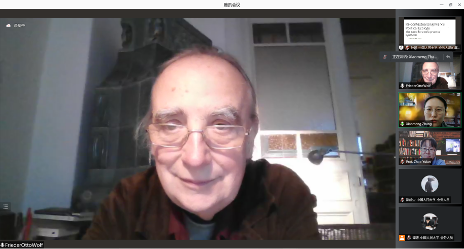 2022年1月6日下午15:30—17:30,由中国人民大学马克思主义学院、中国人民大学21世纪中国马克思主义研究协同创新中心、北京高校思想政治理论课高精尖创新中心、教育部人文社会科学重点研究基地中国特色社会主义理论体系研究中心、中国人民大学马克思主义研究院主办的马克思主义理论前沿论坛第44期在互联网云端顺利举办。本次讲座为德国柏林自由大学弗里德里希·奥托·沃尔夫教授(Prof. Friedrich Otto Wolf)系列讲座的第四讲,主题为“重构马克思政治生态学的情境:新的实践综合之必要”。中国人民大学马克思主义学院副院长张晓萌教授主持此次讲座,中国人民大学马克思主义学院张云飞教授、王莅副教授担任与谈人,40余名来自全国各高校和科研机构的青年教师、学生通过腾讯会议参加了本次讲座。