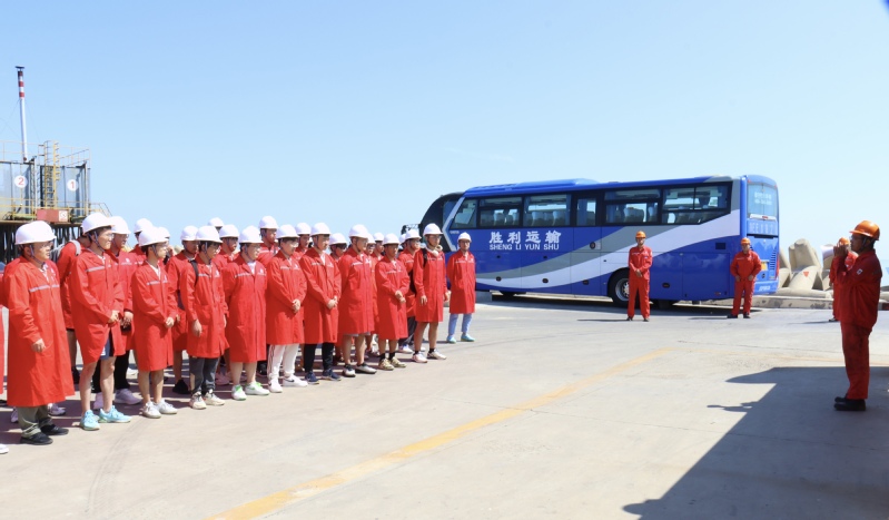 在胜利油田青东采油管理区,博士团成员了解到,胜利油田为深入贯彻“绿水青山就是金山银山”的理念,致力于绿色开发,减少采油对环境造成的影响,青东采油区采用创新的“海油陆采模式”,在占地约20亩的人工岛上65口采油井同时生产,实现高效集约化绿色生产,一条8.48公里的进海路连接人工岛,沿线每隔50米布置桩管,为海中鱼类的回游提供通道,减少对海洋环境的影响。