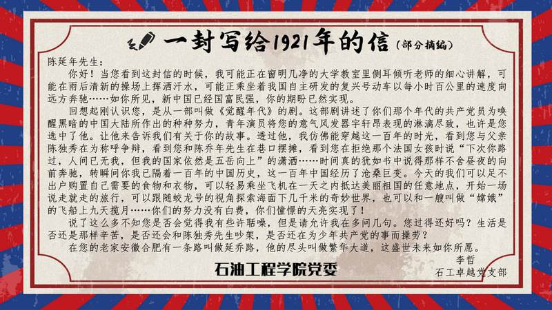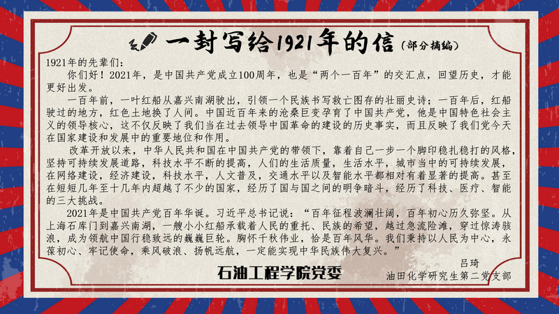 为回顾党的光辉历程,缅怀革命先烈,营造奋进新征程、创造新奇迹、展现新气象的浓厚氛围,学院党委组织开展“一封写给1921年的信”百年寄语活动,面向全院广大师生党员发出征文邀约,征集优秀作品,献礼党的百年华诞。