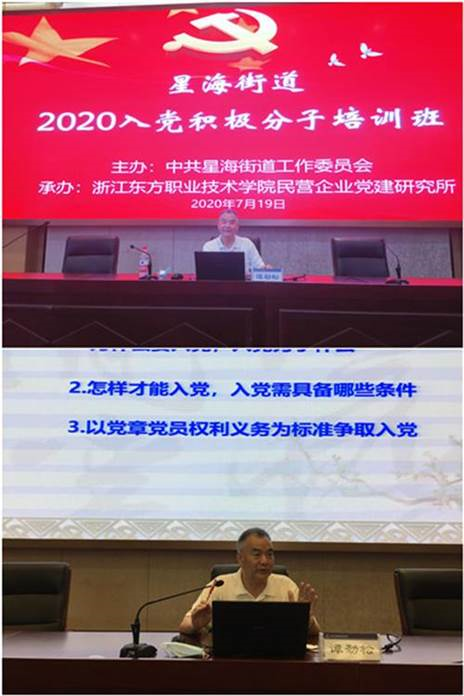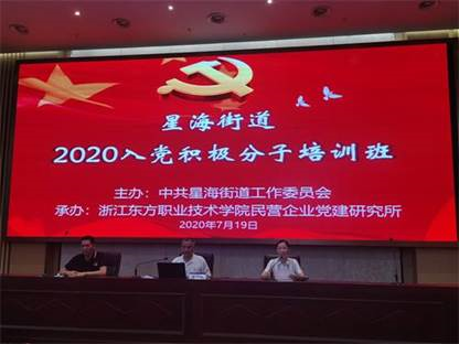 2020年7月19日至20日,由星海街道主办,我院马克思主义学院社科支部民营企业党建研究所承办的2020年度星海街道两新党组织书记轮训班及入党积极分子培训班在我院开班。7月20日上午,培训班开班仪式在我院学术报告厅举行,温州市龙湾区星海街道党工委书记林滢峰、组织委员戚成铁,我院纪委书记何玉龙、马克思主义学院院长谭劲松及社科基础部部分教师代表参加了开班仪式。仪式由星海街道党工委组织委员戚成铁主持,何玉龙书记与林滢峰书记分别致辞。