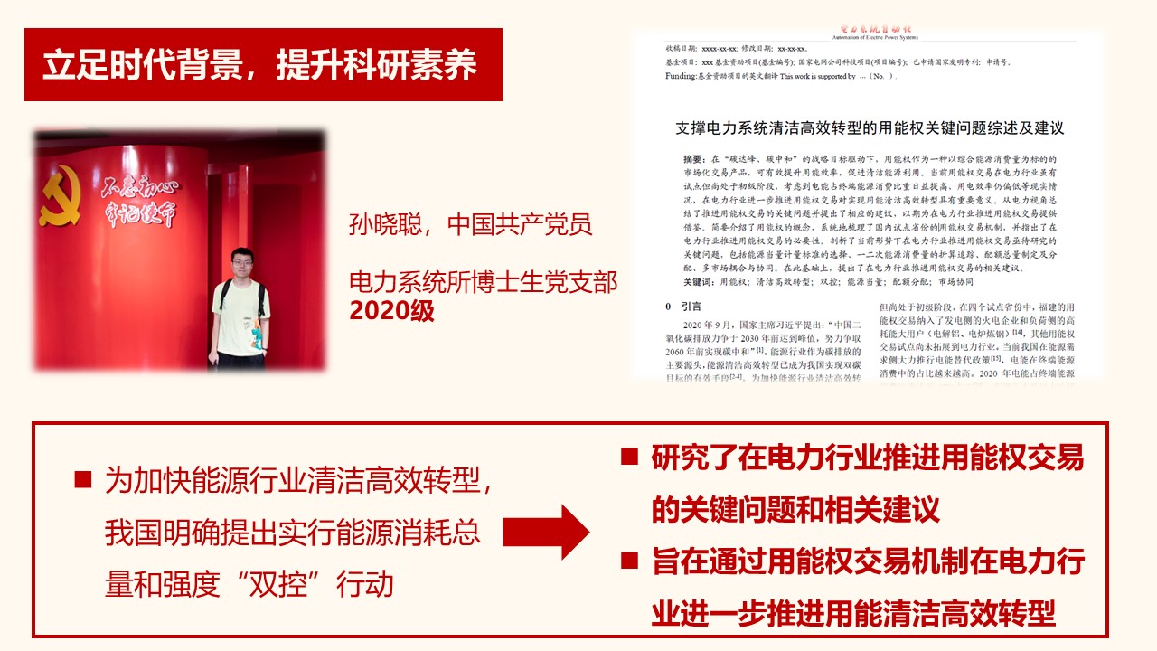 而五年后,在我国已明确提出实现能源双控的背景下,我们支部2020级的孙晓聪对在电力用能权交易的关键问题展开研究,旨在通过用能权交易机制在电力行业进一步推进用能清洁高效转型。