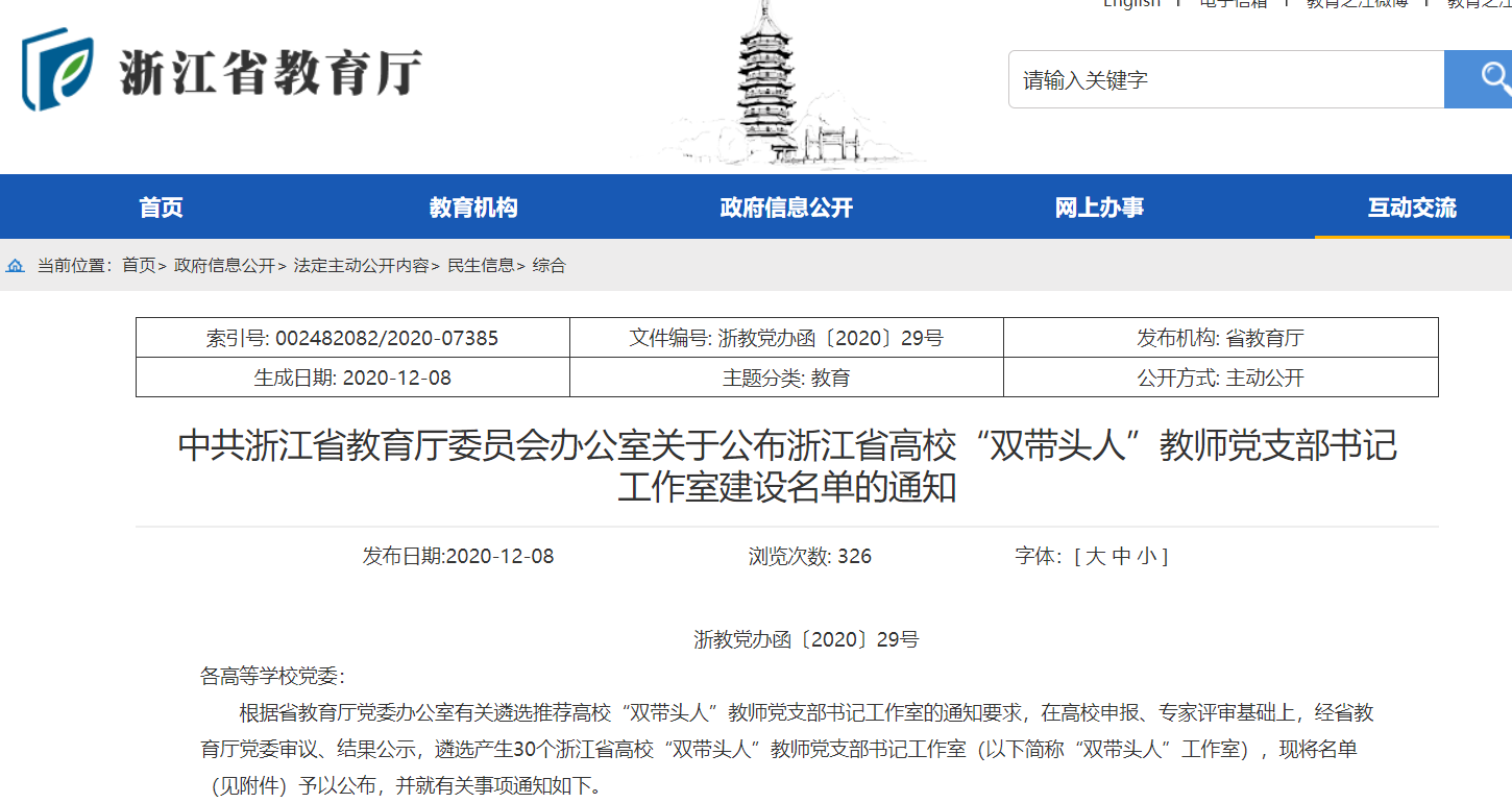入选浙江省高校“双带头人”教师党支部书记工作室建设单位