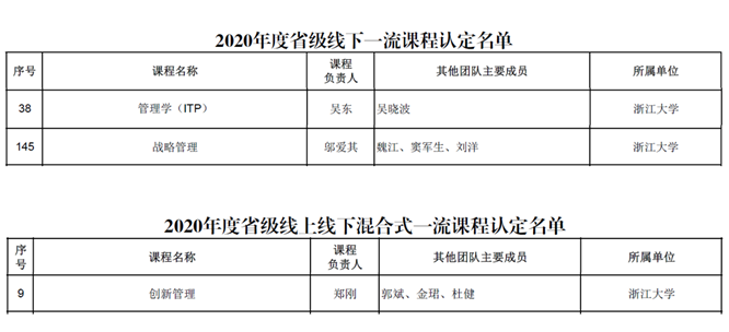 8月5日,浙江省教育厅办公室公布2020年度省级一流课程认定结果,浙江大学管理学院创新创业与战略学系教工党支部党员开设的2门线下课程、1门线上线下混合式课程被认定为2020年度省级一流课程。根据《教育部关于一流本科课程建设的实施意见》(教高〔2019〕8号),此次评选是落实《“双万计划”国家级一流本科课程推荐认定办法》的重要举措,包括线上、线下、线上线下混合式、虚拟仿真实验教学和社会实践等五类省级一流本科课程。获评课程为注重健全和完善具有示范推广价值的专业基础课和专业核心课,在同类课程中具有鲜明特色、良好的教学效果。创新创业与战略学系教工党支部3门课程入选,是创新系支部熔铸以党员为核心的一流师资,着力打造“跟党一起创新创业”课程思政新平台的又一标志性成果,也是浙江大学和管理学院两级党委忠实践行习近平总书记提出的“自觉做中国特色社会主义的坚定信仰者和忠实实践者”,“以本为本”,创新课程内容与形式,打造高质量的一流本科教程的典型示范。