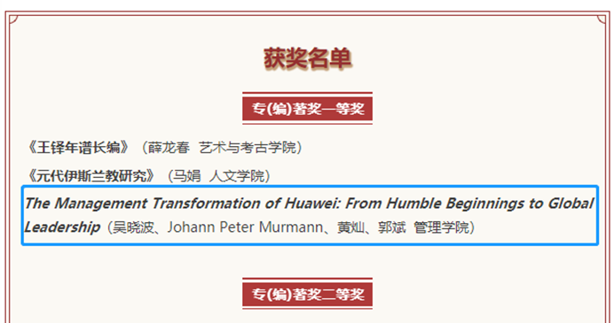 浙江大学管理学院创新创业与战略学系教工党支部党员吴晓波、黄灿教授等撰写的The Management Transformation of Huawei: From Humble Beginnings to Global Leadership(《华为管理变革》英文版)荣获浙江大学第二届哲学社会科学研究专(编)著奖一等奖。该著作英文版由英国剑桥大学出版社2020年出版,是全球第一部从管理学视角系统梳理华为管理变革全过程、探索中国企业的非线性成长和超越追赶规律的著作,赢得了国际著名管理学权威学者的好评,对中国管理学赢得国际话语权有重要现实意义和学术价值。