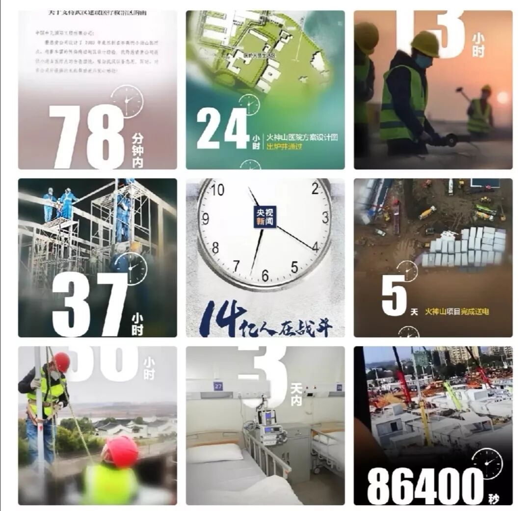 建医院这速度有24小时内,拿出设计图纸;37小时完成钢骨架安装焊接;3天完成雷神山送电,5天完成火神山送电; 10天交付!建筑工人、运输司机、工程师、 后勤保障,只因需要,他们以火速十神速完工!86400秒“云监工”,一次次注视与陪伴,14亿人在战斗每个你都算数!