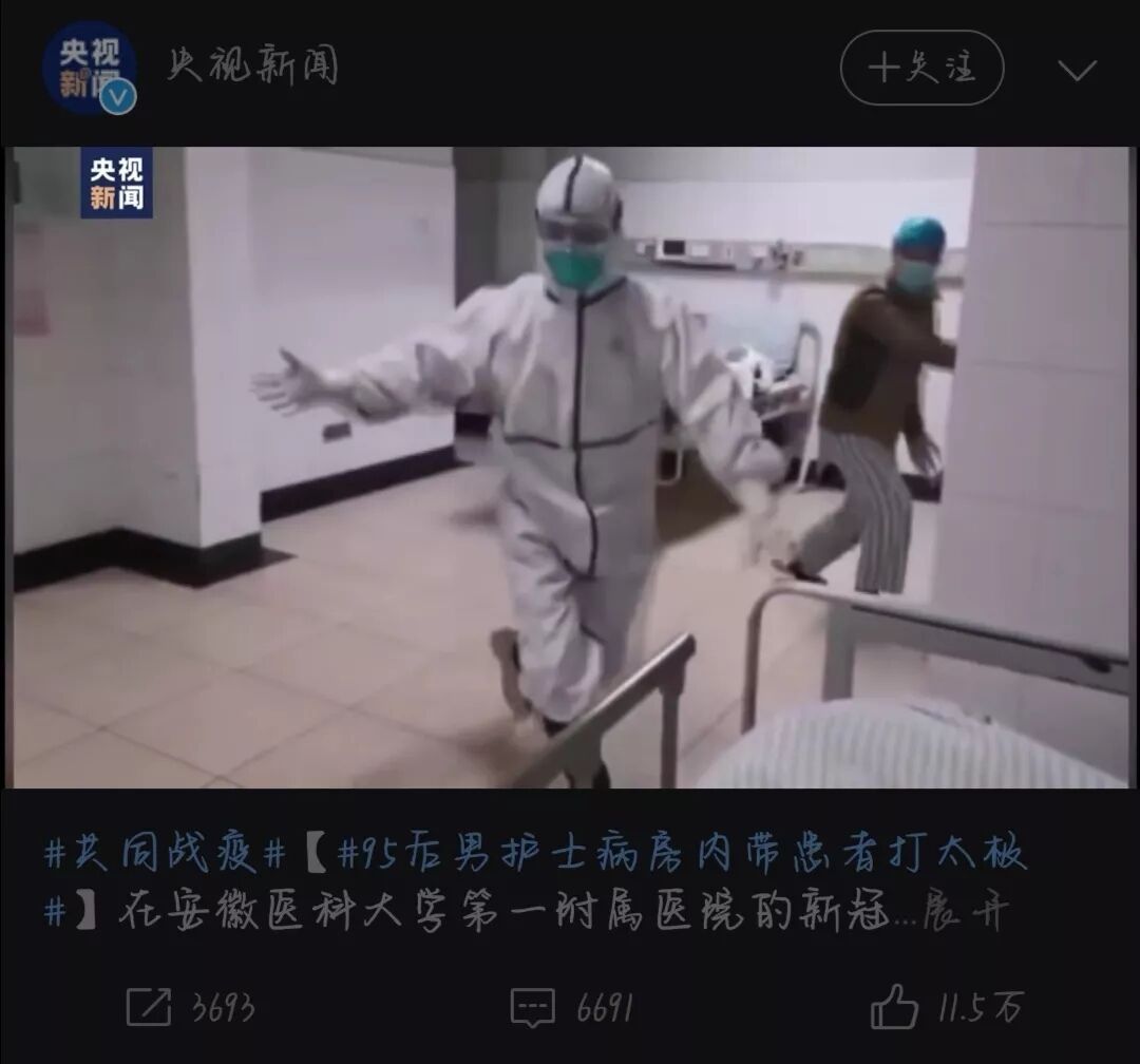 为了不让患者和医护人员紧张和焦虑,各个病房或隔离区,医护人员带着患者唱起了歌,跳起了广场舞,打起了太极拳。冷冰冰的医院不再冷清,患者积极配合治疗,医护人员也尽心尽力地为每个人治疗。人间为“情”字最美,它承载着国人的关心,托起了患者对生的希望。