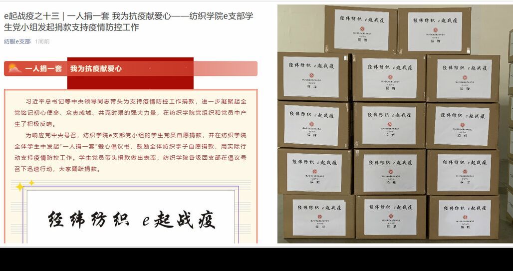 “疫敌”当前,舍我其谁。在这场战“疫”中,纺织学院e支部的党员和入党积极分子在党旗的指引下,积极投身于这场没有硝烟的战争中,勇敢无畏地守护着家园和身后群众的平安与健康,用实际行动践行着初心使命和党员担当。e支部的学生党小组利用自己的专业特色,在支部教师的支持下,联系宁波雪狼户外服饰有限公司,在学院全体学生中发起“一人捐一套”的爱心捐赠活动,为武汉科技大学天佑学院捐赠医护用品。党员教师在参与其中支持学生的爱心之举的同时也用自己的方式通过其他途径为此次疫情献爱心。