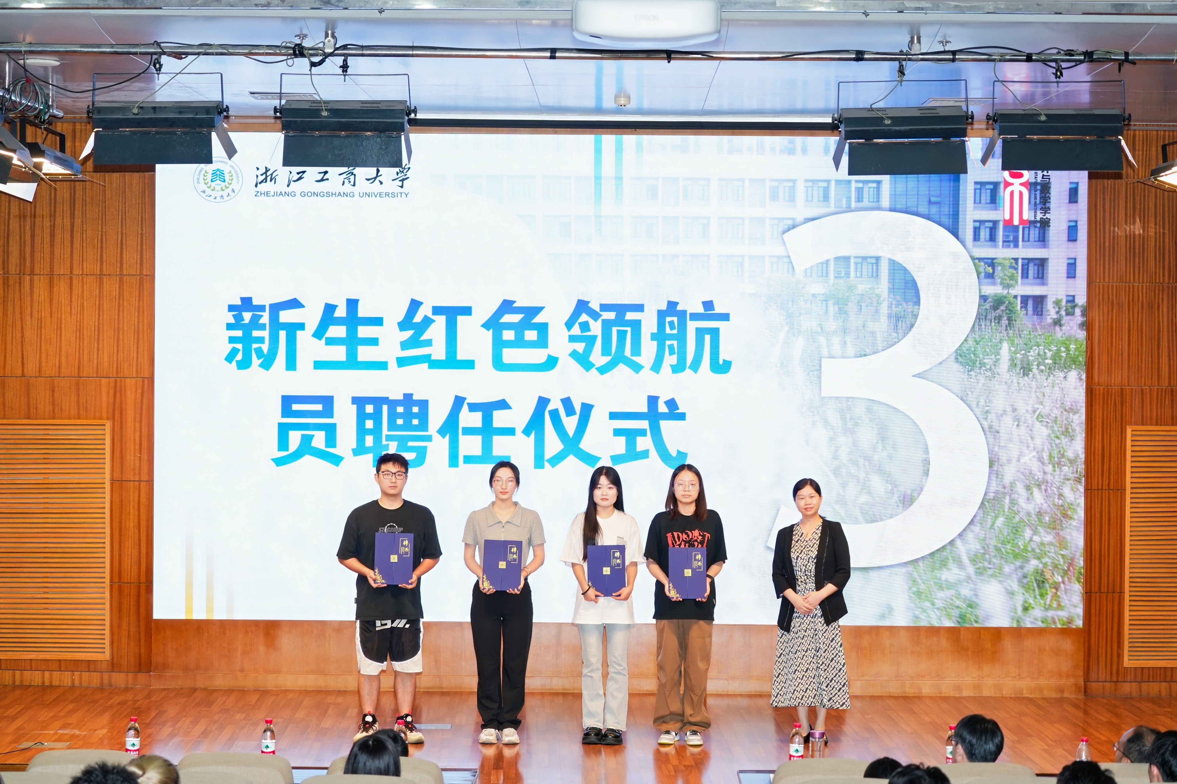 副院长陈骥宣读研究生新生红色领航员聘任文件,党委书记陈钰芬为红色领航员颁发聘书。