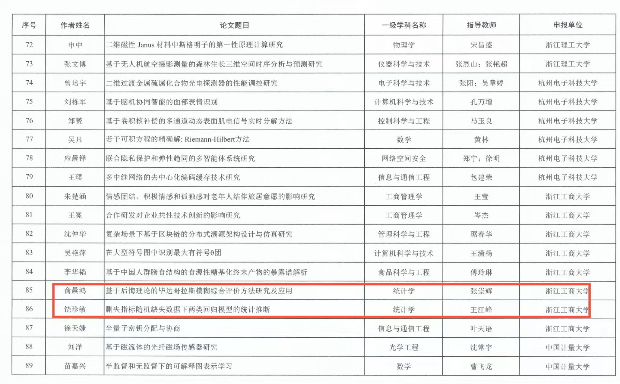 近日,浙江省研究生教育学会公示了2023年浙江省优秀博、硕士学位论文名单,统计与数学学院3篇论文分别入选浙江省优秀博士学位论文、浙江省优秀硕士学位论文。其中,2023届毕业生陈思超的《基于信任网络的模糊在线推荐算法及应用研究》(指导老师:苏为华教授)入选2023年浙江省优秀博士学位论文,2023届毕业生俞晨鸿的《基于后悔理论的毕达哥拉斯模糊综合评价方法研究及应用》(指导老师:张崇辉教授)、饶珍敏的《删失指标随机缺失数据下两类回归模型的统计推断》(指导老师:王江峰教授)入选浙江省优秀硕士学位论文。