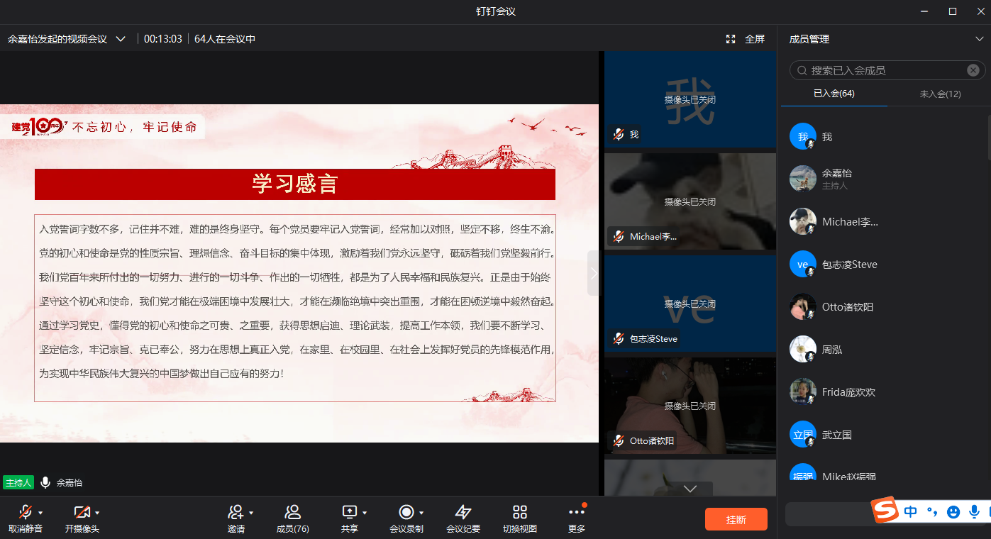 在学习会上,同志们都认真听讲,并做好学习笔记,在将近尾声时,同学们踊跃发言,谈自己的入党初心。