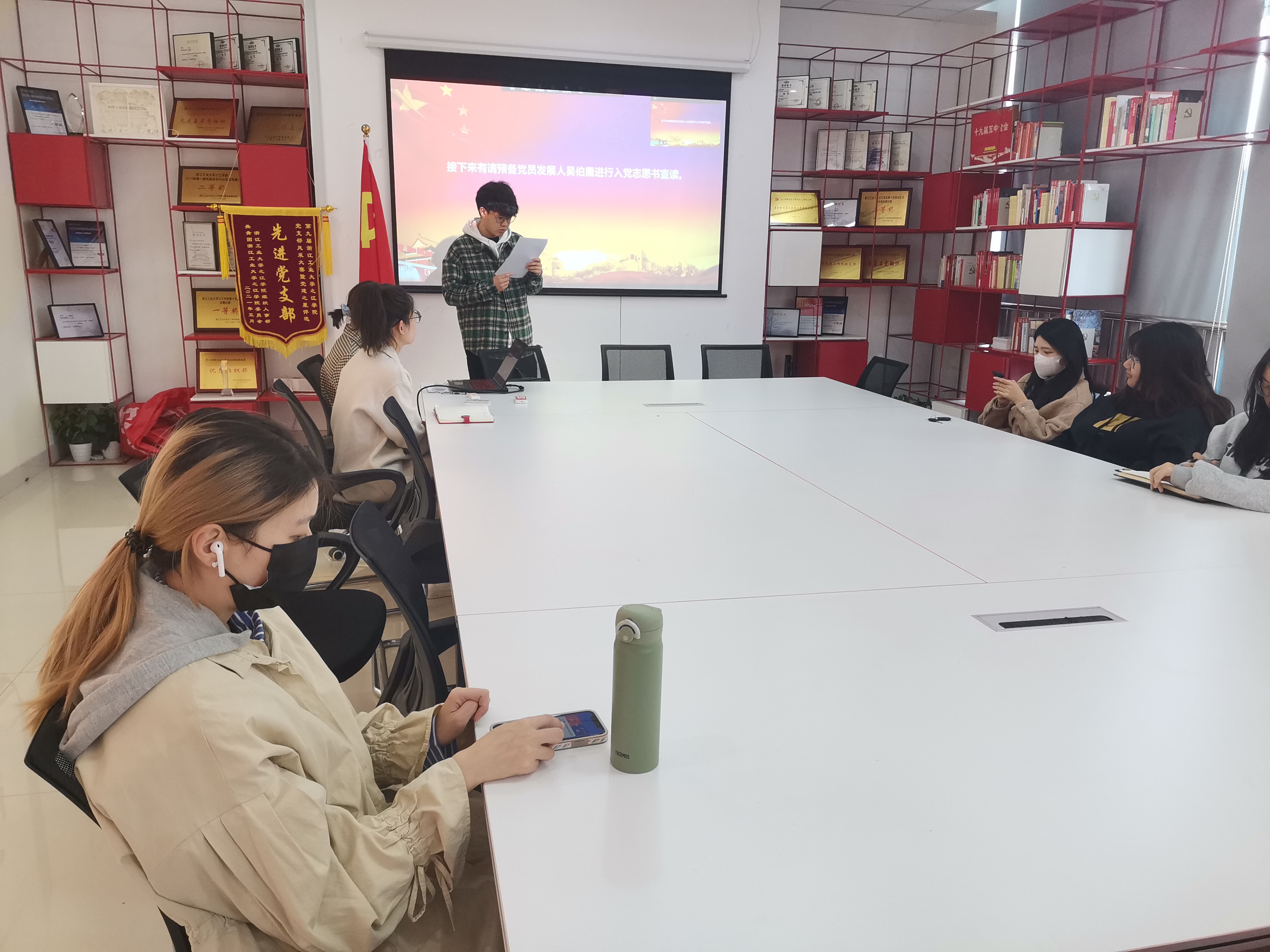 在入党积极分子转预备党员环节中,入党积极分子宣读入党申请书,结束宣读后由设计学院2021级辅导员以及正式党员讨论转预备结果。后公布讨论结果,入党积极分子正式成为预备党员。