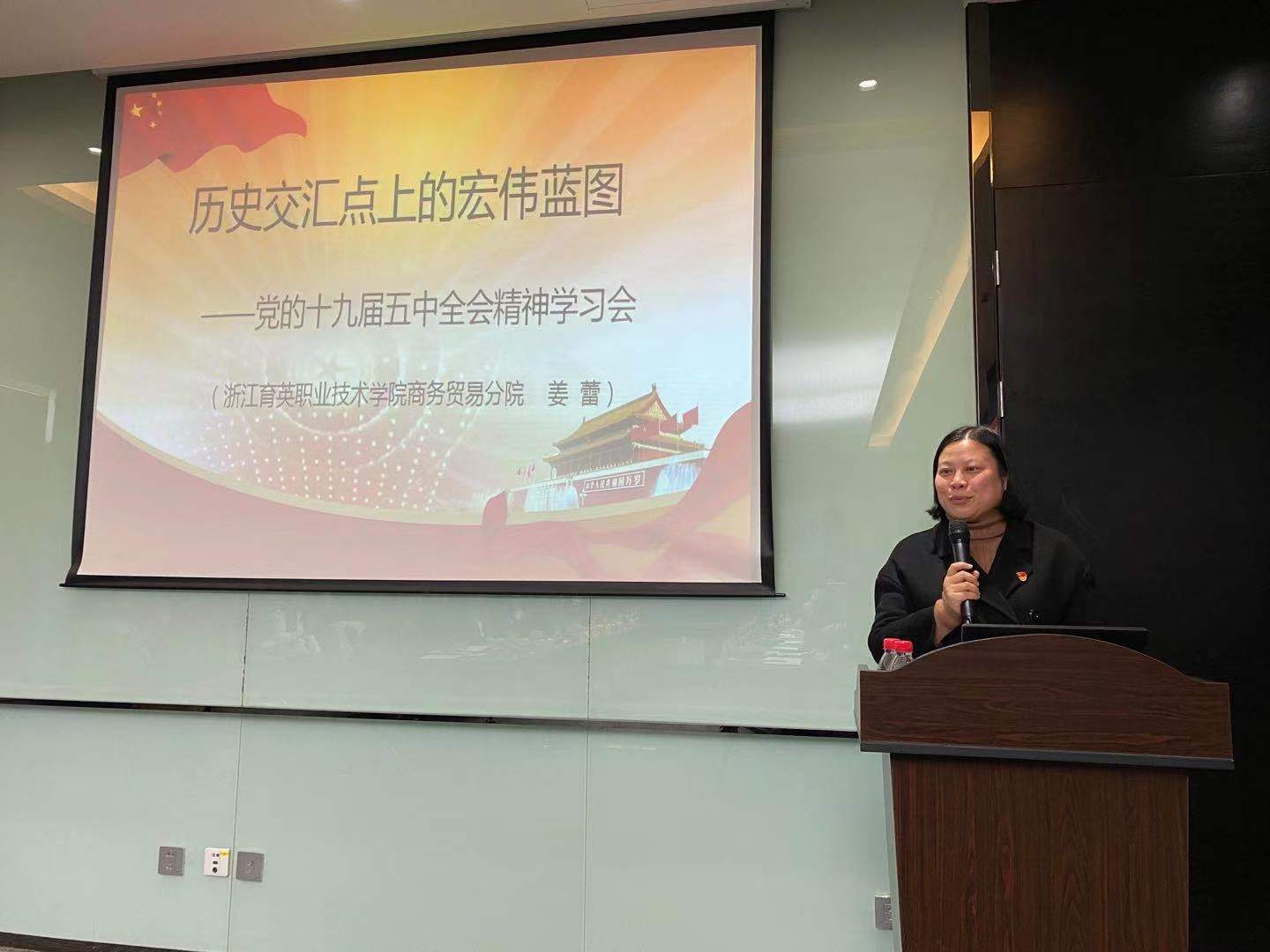 对接仪式结束后,两个支部的党员共同进行了党课学习。商贸分院党总支书记姜蕾以“历史交汇点上的宏伟蓝图”为主题,带领大家一起学习了党的十九届五中全会精神。学习会后,双方支部的党员代表进行了学习心得的交流。