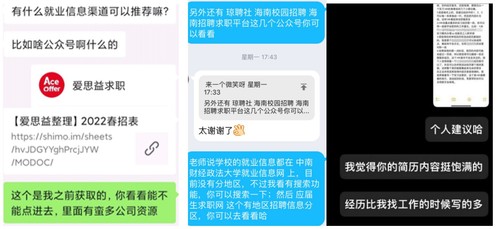 分享求职经验,协助修改简历。就业方面,支部就业先锋结合自身经历向同学们分析目前就业形势、推荐简历投递渠道、传授面试技巧、为同学们修改简历、模拟面试等,提高找工作同学在简历筛选及面试环节的通过率。凌忠鹏同学结合过往的实习经验对帮扶对象的简历提出了一些修改意见,如格式排版上的优化方案,活动内容的量化体现。章嘉薇同学在拓展就业信息获取渠道上提供建议,通过就业微信公众号、就业话题搜索、就业网信息检索等渠道收集就业信息百余条发送给帮扶对象。