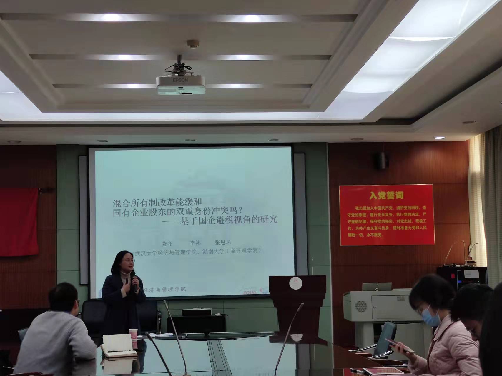 2021年12月23日,“中南·会计Seminar”第109期在文泉楼南401成功举行。武汉大学陈冬副教授应邀为我院师生作了题为《混合所有制改革能缓和国有企业股东的双重身份冲突吗?——基于国企避税视角的研究》的学术报告。