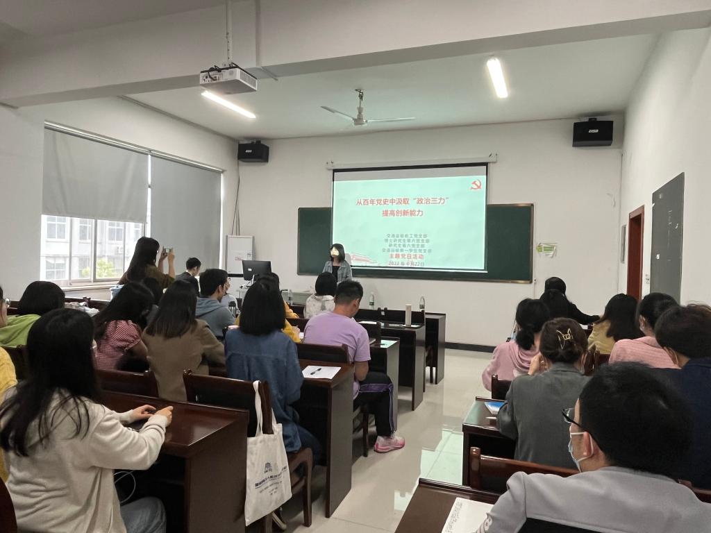 活动伊始,李冰洁同志简要介绍活动背景和流程,院党委委员、交通运输教工党支部书记叶峻青同志讲授“从百年党史中汲取‘政治三力’提高创新能力”主题党课。叶峻青同志引用《寻乌调查》、大别山斗争、红军长征等历史资料,引导同志们积极思考从而加深同志们对政治判断力、政治领悟力以及政治执行力的理解。从国家、学校和个人三个视角,结合多个方面,回答了为何创新和如何创新两个关键问题,发人深省。
