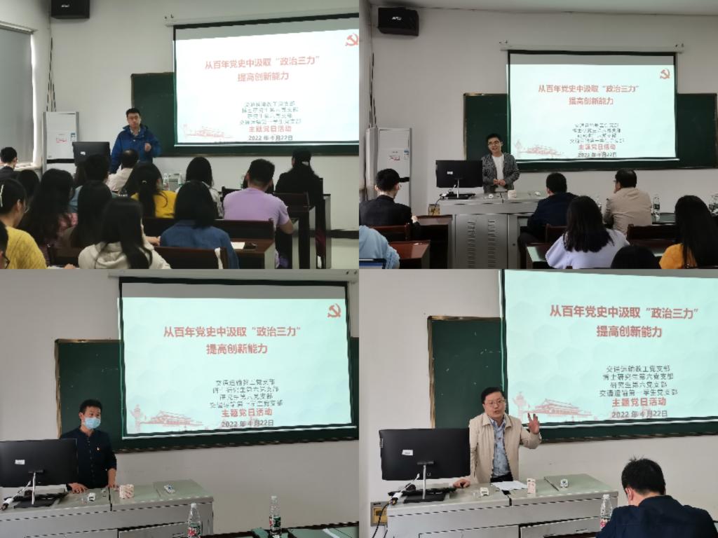 4月22日下午14:00,交通运输教工党支部、博士研究生第六党支部、研究生第六党支部和交通运输第一学生党支部在交通楼509开展“从百年党史中汲取‘政治三力’提高创新能力”联合党日活动。研究生第六党支部书记李冰洁同志主持本次会议,各党支部成员参加会议。