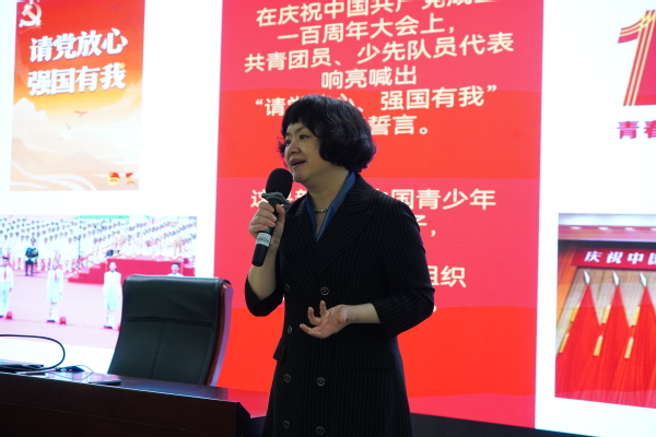 开班仪式结束后,黄永宜做《学深悟透习近平总书记关于青年工作的重要思想,践行“请党放心、强国有我”的青春誓言》主题报告,围绕学理论、讲政治、勤奋斗等三个方面,深入解读了党的二十大报告中对青年的寄语,深刻阐释了习近平总书记关于青年工作的重要思想。她强调,政治性是共青团的第一属性,讲政治要从小抓起,经过知情意行的过程不断培养,团员青年要坚定自己的政治立场,锤炼政治品性。习近平新时代中国特色社会主义思想是马克思主义时代化、中国化的最新成果,是我们站在人类命运共同体的高度看世界的科学的世界观和方法论。马克思主义致力于积极地改造世界,青马成员要在实践中认识到马克思主义的真理性,深刻领会“两个结合”、务必做到“六个坚持”,矢志不渝做马克思主义的信仰者、传播者、实践者。黄永宜提出,青年应该把入队、入团、入党作为追求人生理想的三部曲,为共产主义事业奋斗终身,她勉励同学们努力做有理想、敢担当、能吃苦、肯奋斗的新时代好青年,在青春赛道上奋力跑出属于自己的最好成绩。