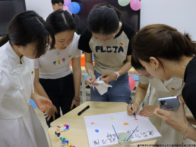 在DIY手指画趣味游戏中毕业生党员们纷纷发挥创意,用手指在画布上绘制出各种图案和色彩,摁下的手指印是他们为自己五年青春画下的句号,也是他们开启人生新阶段的开始。