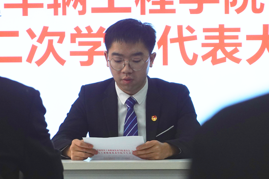 当天下午14:00,车辆工程学院第二次学生代表大会在激昂的国歌声中拉开了帷幕。首先由重庆工业职业学院学生会主席李鸿浩宣读了《关于召开重庆工业职业技术学院车辆工程学院第二次学生代表大会的批复》,并通过了本次学代会资格审查委员会关于代表资格的审查报告。