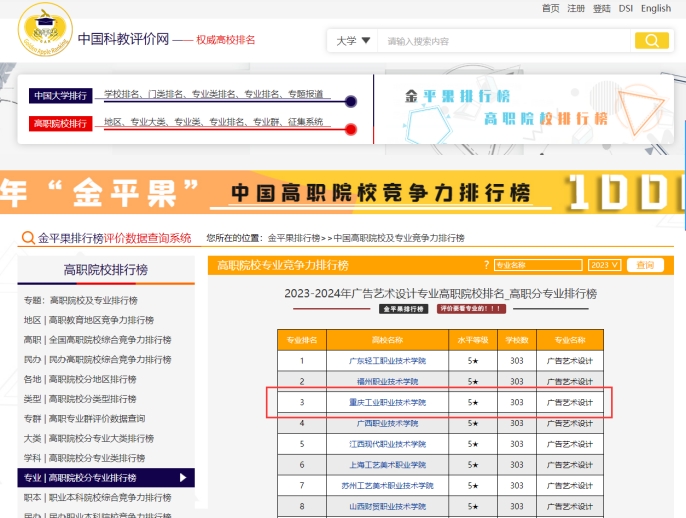 重庆工业职业技术学院设计学院传媒设计教研室广告艺术设计专业荣获2023年全国“金平果”高职院校专业排行榜第3名。