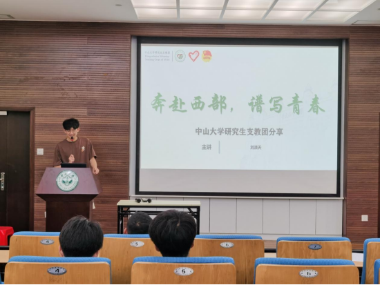 随后,中山大学第24届研究生支教团成员刘淏天同志带来主题为“奔赴西部,谱写青春”的专题党课。他总体介绍了中山大学研究生支教团的历史及发展概况,分享了申请支教的报名与选拔过程,讲述了奔赴基层支教的初心、支教过程中面临的挑战以及收获。他表示,奋斗是青春最亮丽的底色,选择投身基层是为了更好地了解国情、民情,磨炼自己的意志和能力,同时在平凡的岗位上为人民群众和国家发展贡献自己的力量。