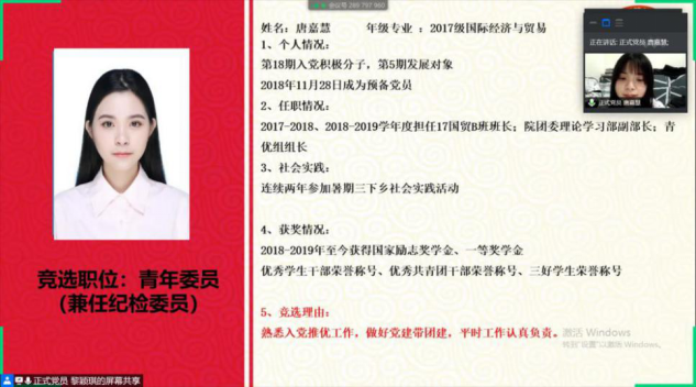 5月27日晚20:30分经济与贸易学院学生第一党支部在腾讯会议召开党员大会,讨论并选举增补支部委员。本次会议由宣传委员黎颖琪同志主持,经济与贸易学院学生第一党支部书记黄小润老师及支部全体50名党员同志出席会议,其中应到正式党员27名,实到正式党员27名,符合选举要求。