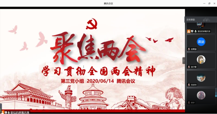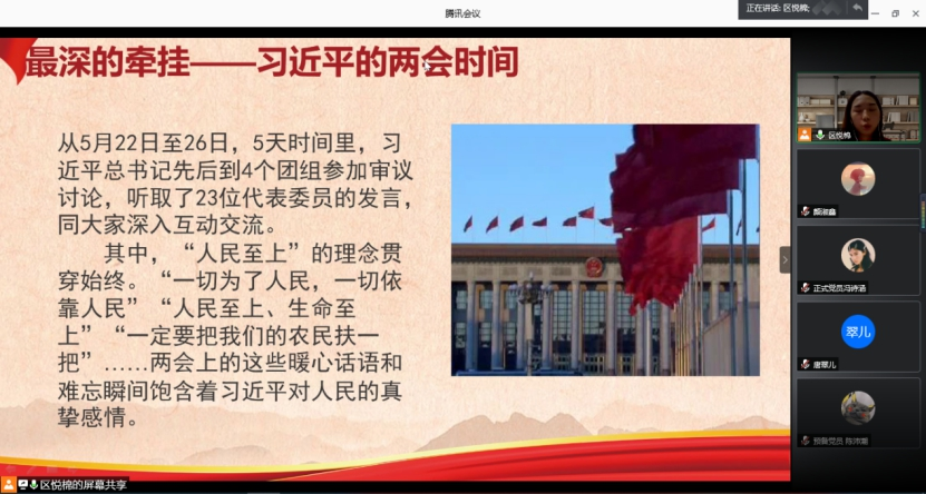 2020年6月17日组长区悦棉同志主持第一党小组以“学习贯彻全国两会精神”为主题的专题学习会议。会议流程分为学习两会内容,了解两会关注热点、观看两会内容短片、分享交流学习两会内容及贯彻两会精神的感想、合影留念四个环节。