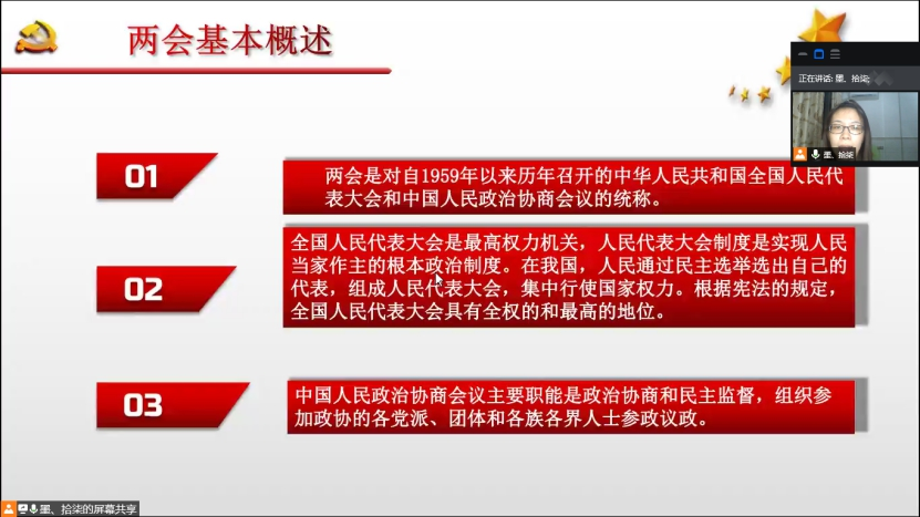 郑晓琪同志说道:这次两会我最大的感受就是觉得两会向全世界展示了中国人民无惧任何困难和挑战,坚定不移走中国特色社会主义道路,去实现既定目标的信心与决心,让我感受到无论是什么样的“瘟疫”,都无法阻止中国前进的脚步。紧接着是张妍同志表达了无论是在学习、工作、还是生活中,我们都要时刻牢记自己作为一名党员的责任和义务的观点。