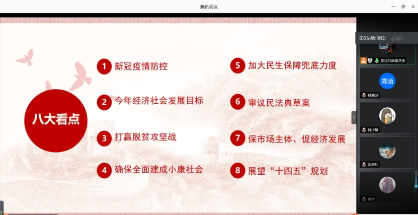 为贯彻学习2020全国两会精神,第二党小组组长郑晓琪同志向组员介绍了两会五大看点,紧接着各成员围绕近期时政,了解两会热点,学习贯彻全国两会精神,分享自己的感受心得。