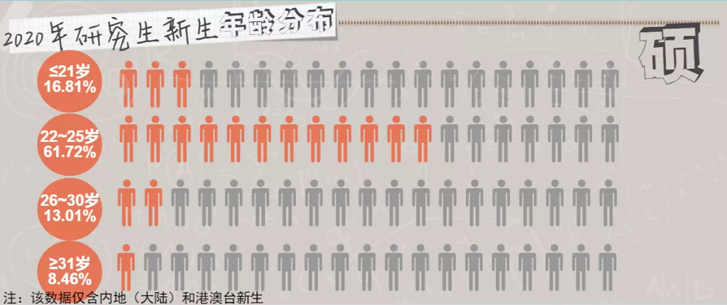 2020级硕士研究生新生年龄跨度较大,大多同学年龄集中在22至25岁之间,年龄最小的硕士生19岁。