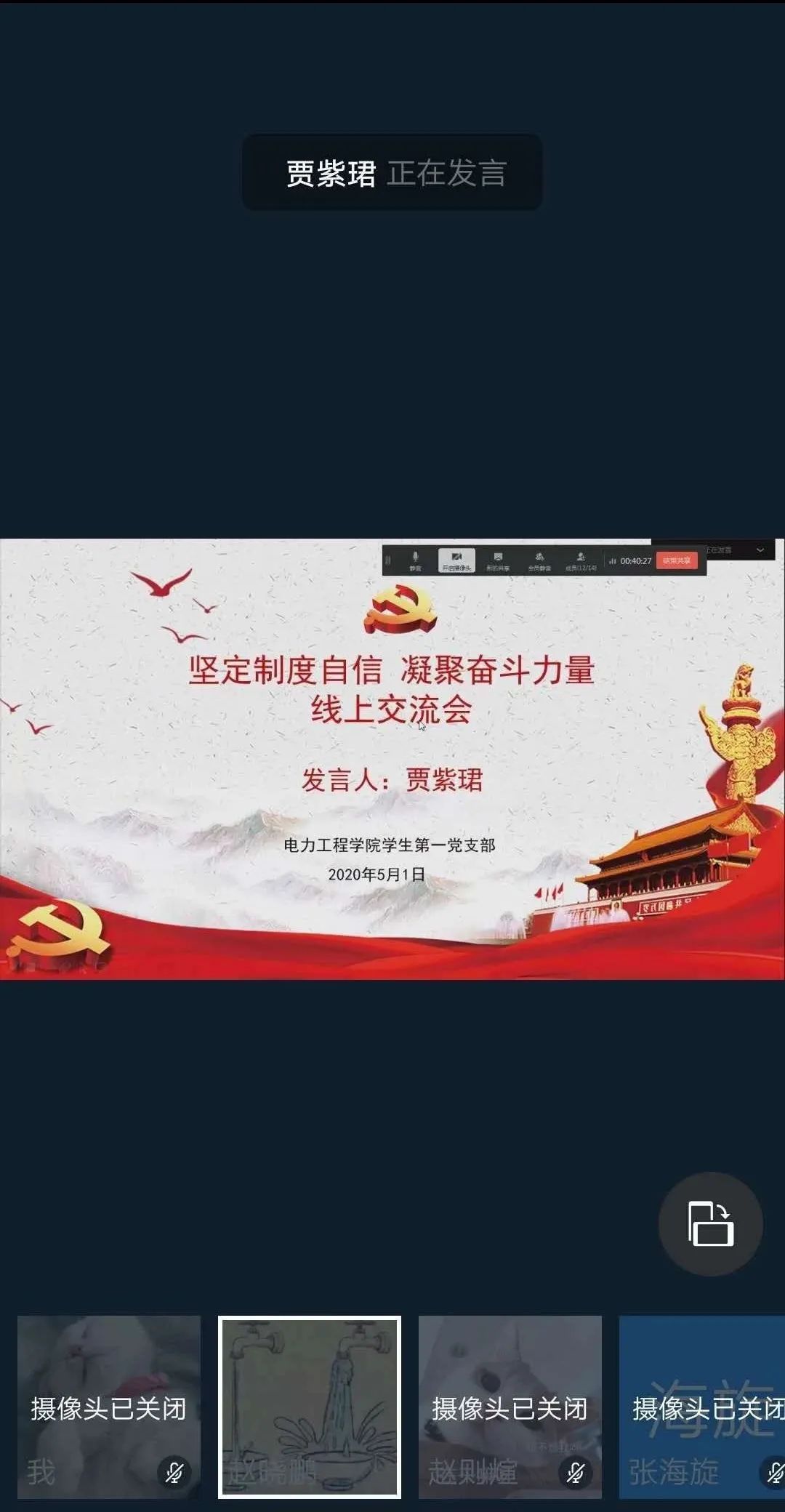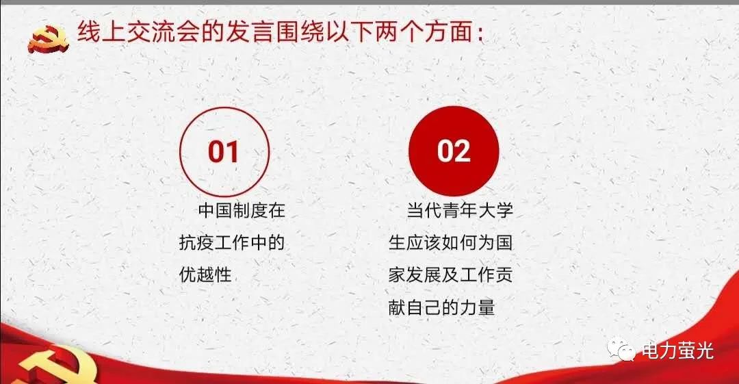 2020年5月1日劳动节当天,郑州电力高等专科学校电力工程学院学生第一党支部开展了“坚定制度自信,凝聚奋斗力量”主题党日活动。以中国制度在抗疫中的优越性和当代青年大学生应该如何为国家发展贡献自己的力量为主题展开讨论。