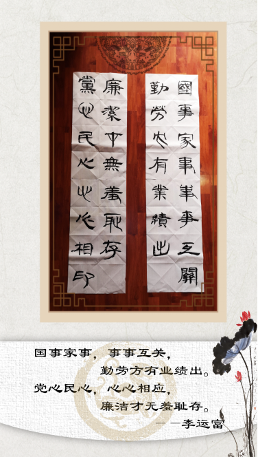 1、国事家事,事事互关,勤劳方有业绩出;党心民心,心心相应,廉洁才无羞耻存。——李运富