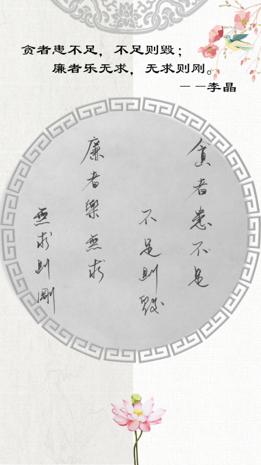 5、贪者患不足,不足则毁;廉者乐无求,无求则刚。(李晶)